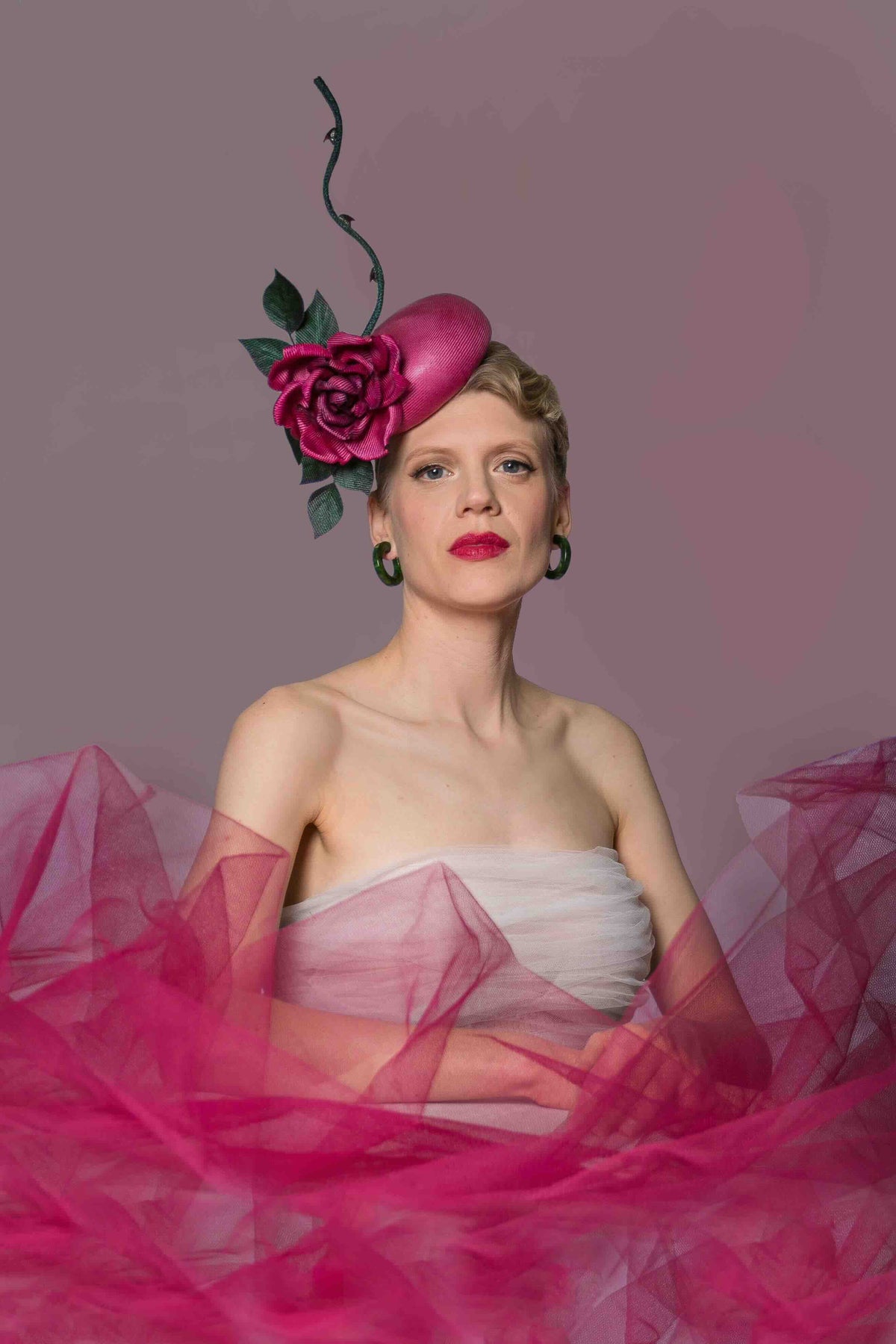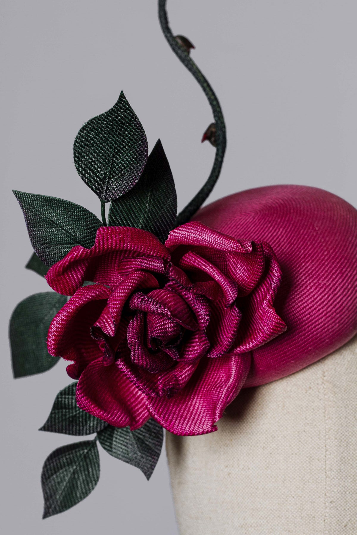 Introducing "The Homage" Cocktail Hat - the perfect accessory for those seeking a small but dramatic statement piece. Made with rare vintage pari-buntal straw in the most luxurious of pink/purple, it is decorated with a beautiful rose and leaves made using the same material. This hat is Royal Enclosure-approved and adds a stylish pop of colour to any outfit. It can also be easily used for a stylish country wedding.