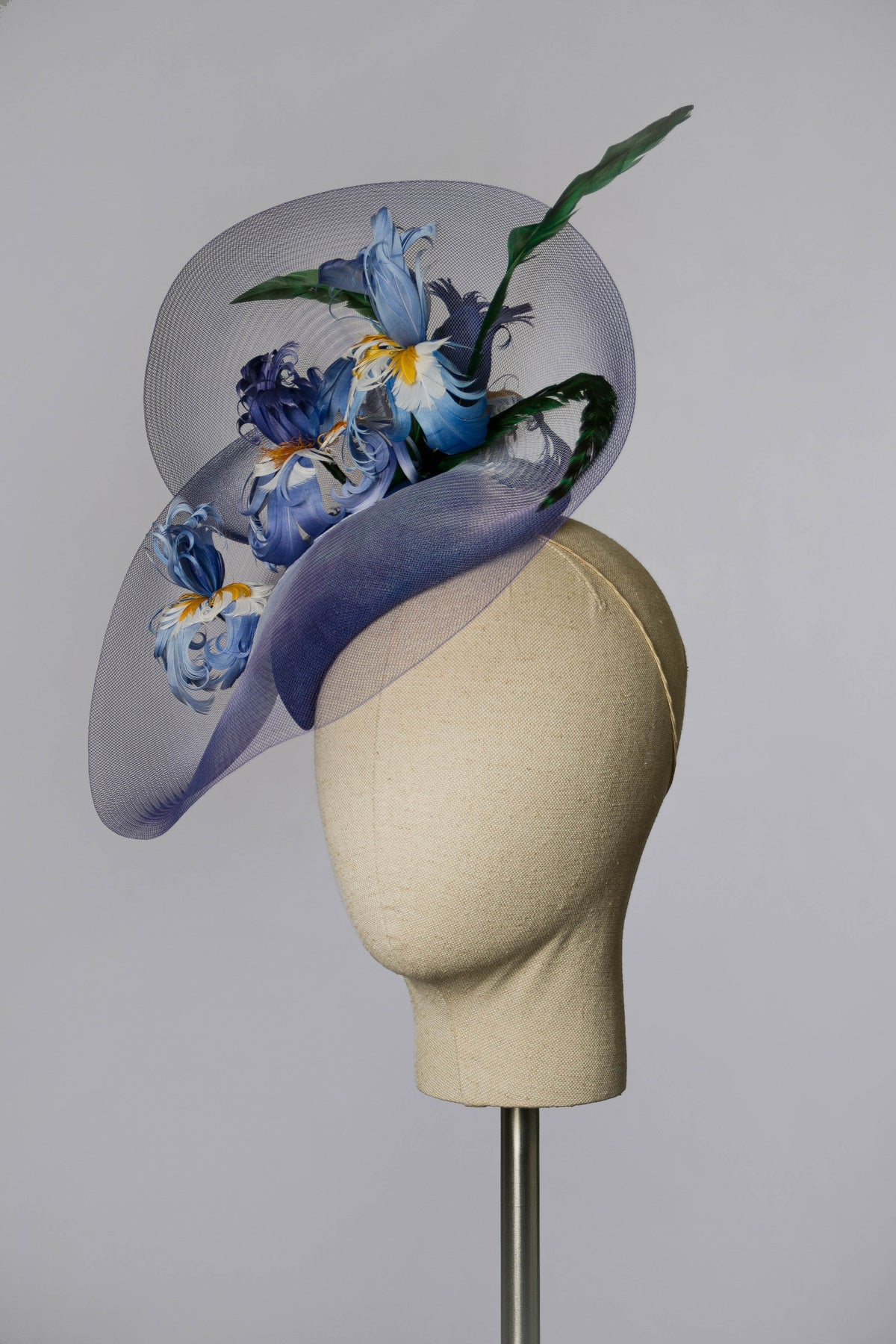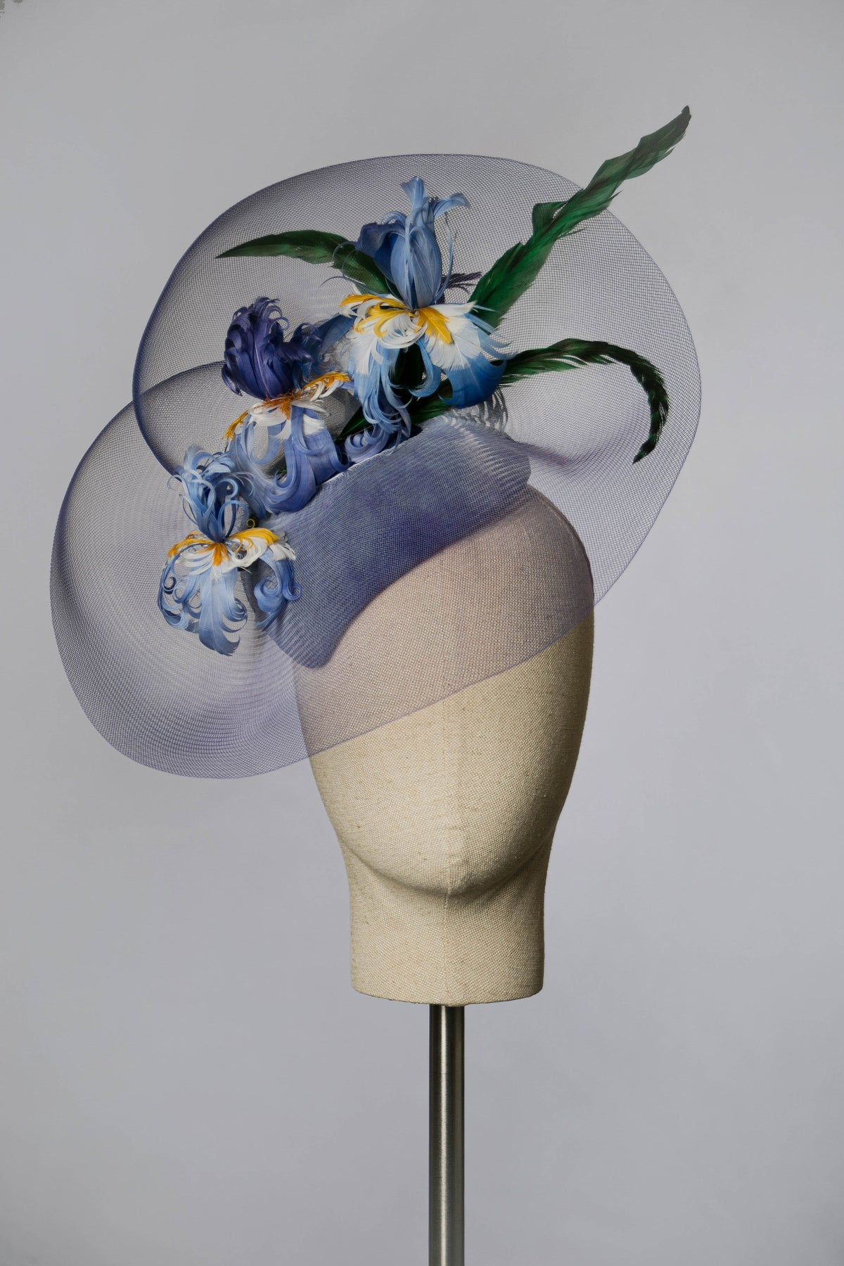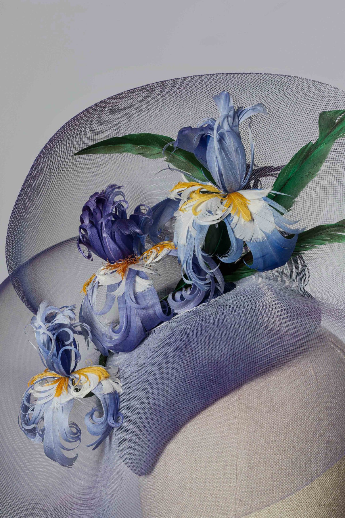 One of my favourite designs from the past year is now revisited: the "Iris" 2.0 cocktail hat is a beautiful medium-sized piece in a violet and blue colour combo, with a burst of vibrant green. It is made using plain crinoline, sprayed at the edges, secured on a comfortable teardrop-shaped base, and decorated with hand-dyed feather irises and leaves.