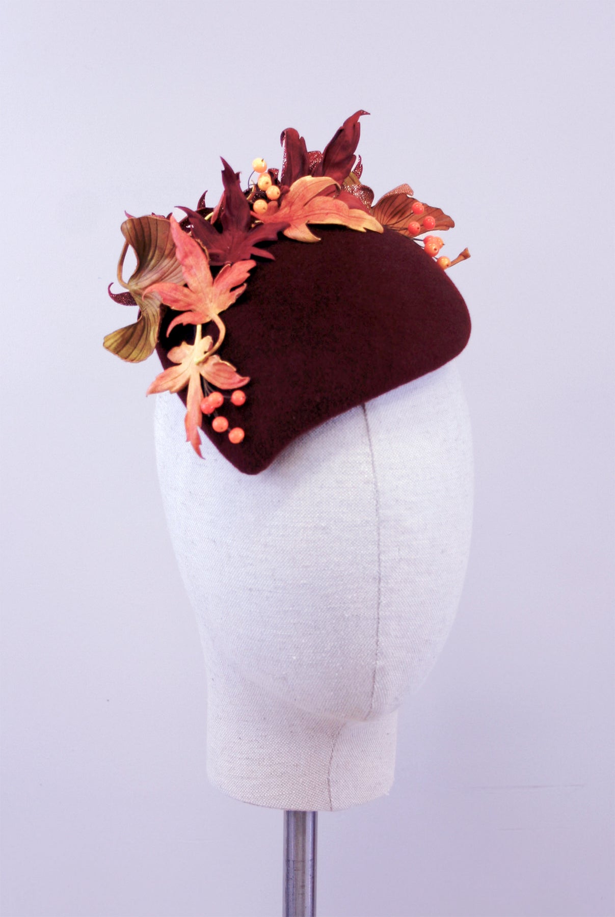 A luxurious, deep brandy velour felt teardrop cocktail hat, decorated with hand-painted leather leaves, finished with handmade glass beads. A beautiful investment piece, ideal for a winter wedding, a special occasion or winter racing.