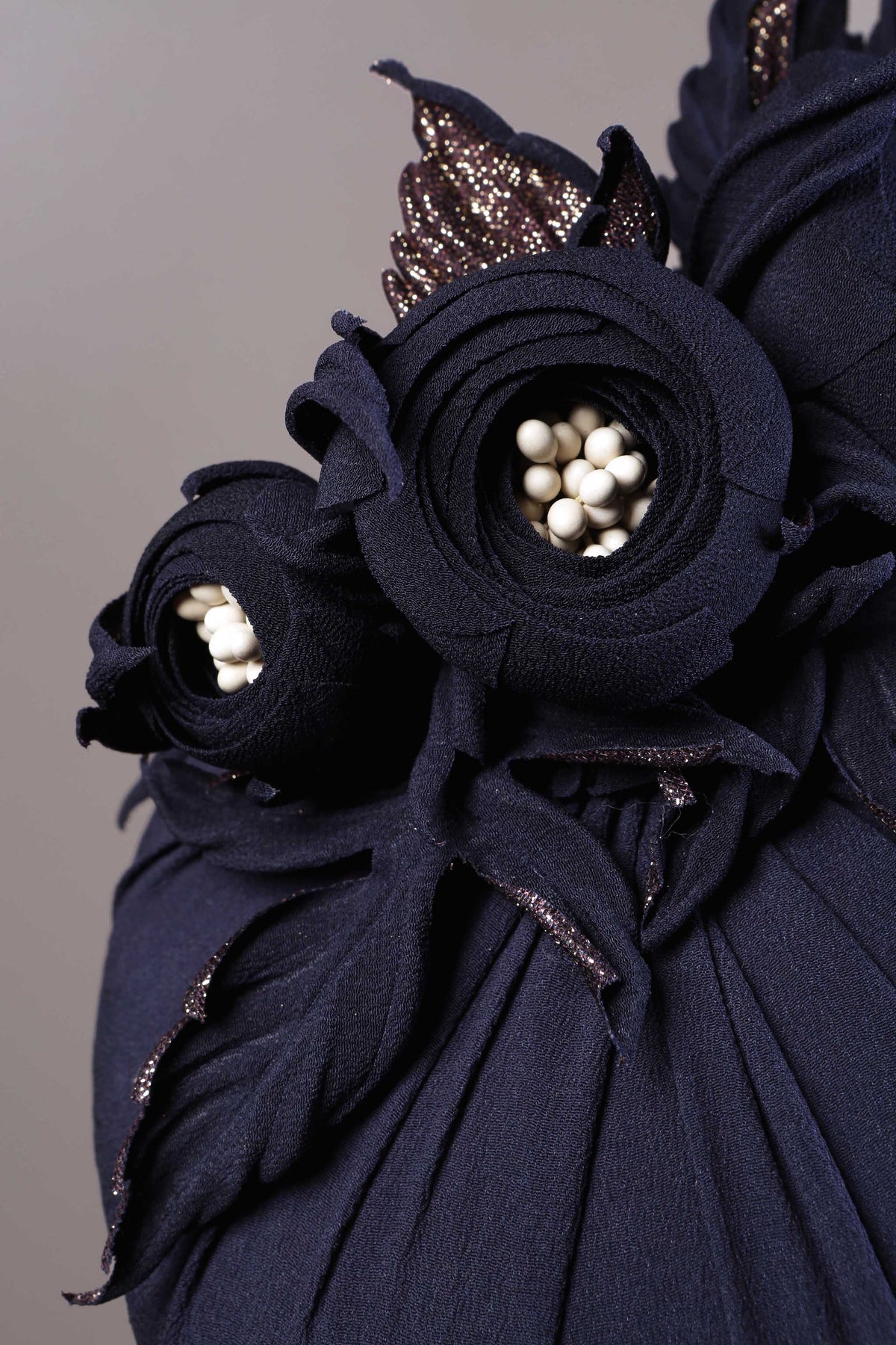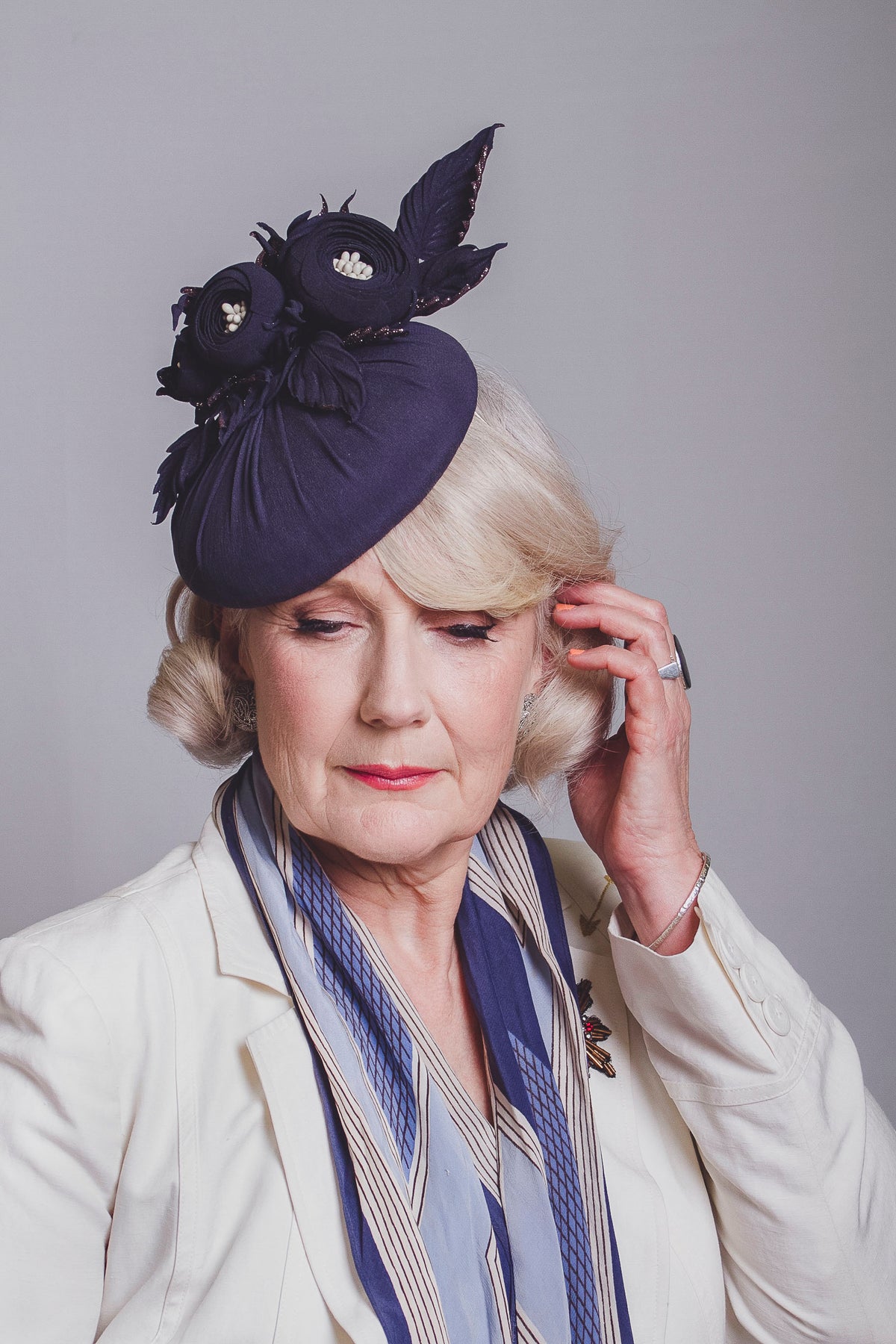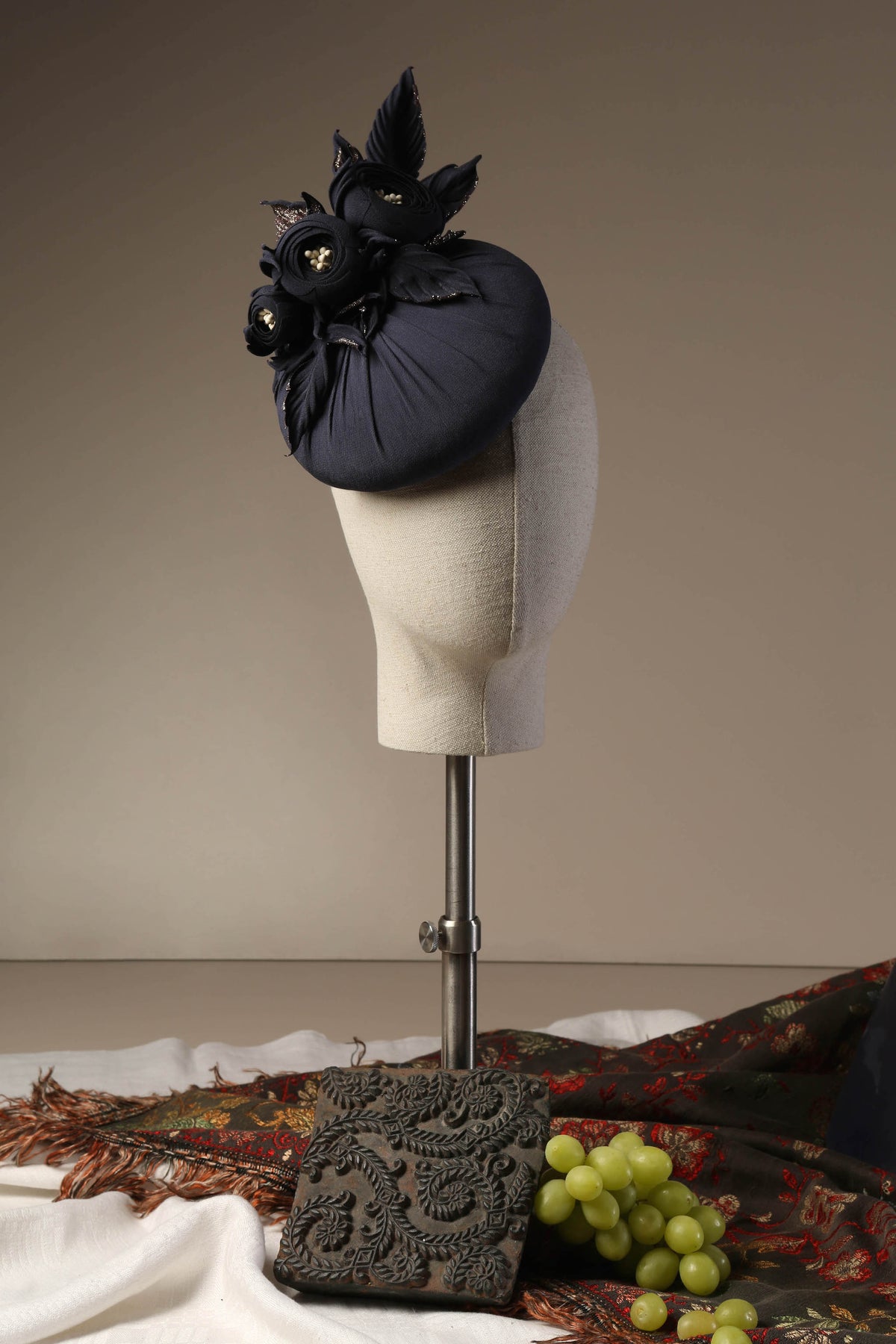 A beautifully made navy Crepe de Chine silk button cocktail hat decorated with handmade, cropped silk roses. This design can be made in other colours and fabrics to adapt to any wardrobe needs. An incredibly elegant piece, perfect for the race season, for a formal wedding or a garden party lover.