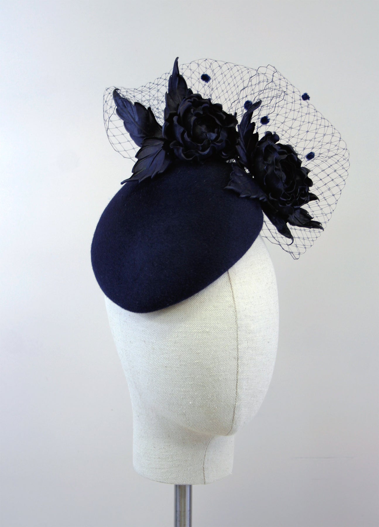 A classic and versatile velour felt beret, decorated with leather roses and leaves, finished with spotty veiling. A beautiful investment piece, ideal for a winter wedding, a special occasion or winter racing.