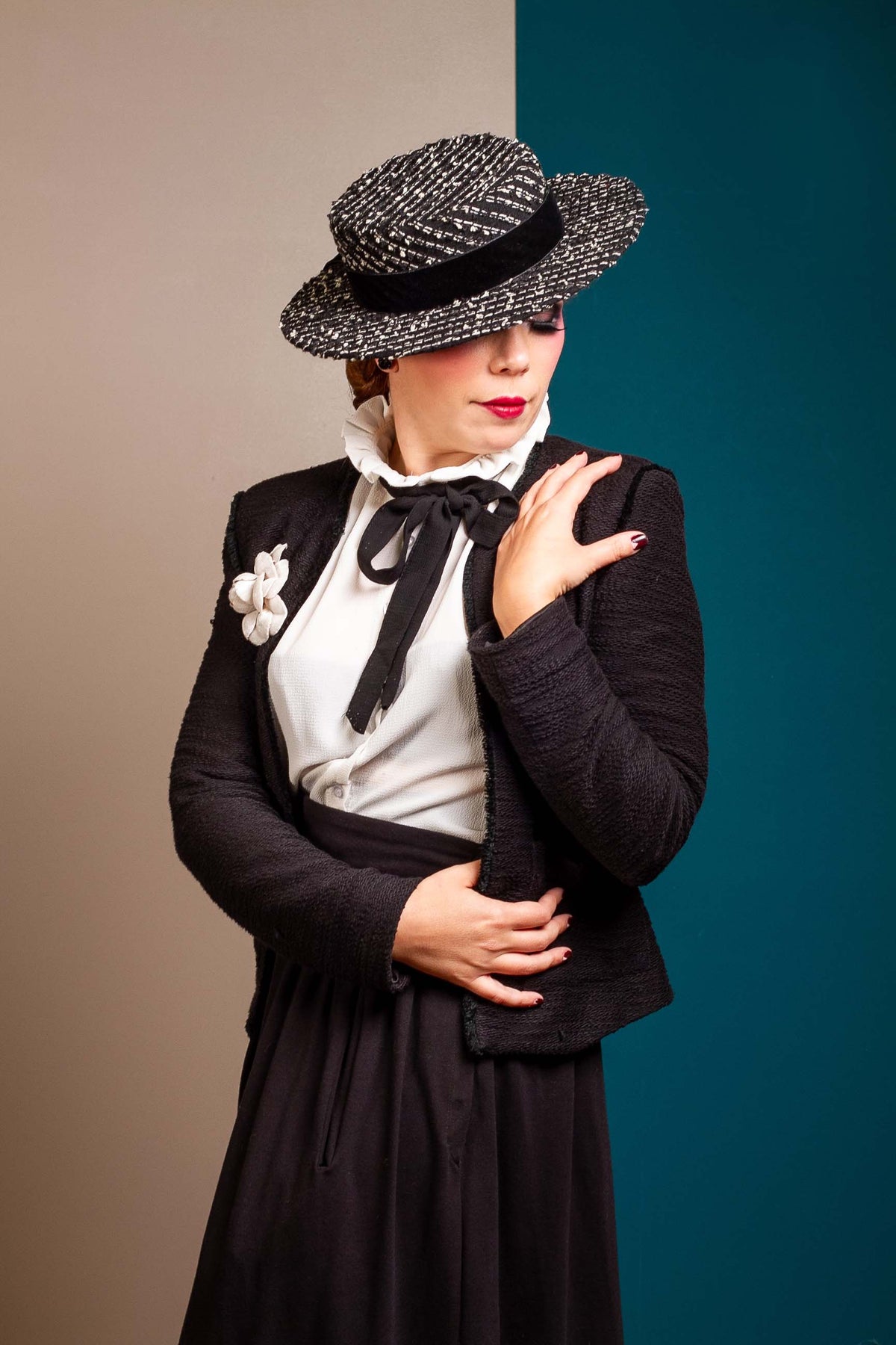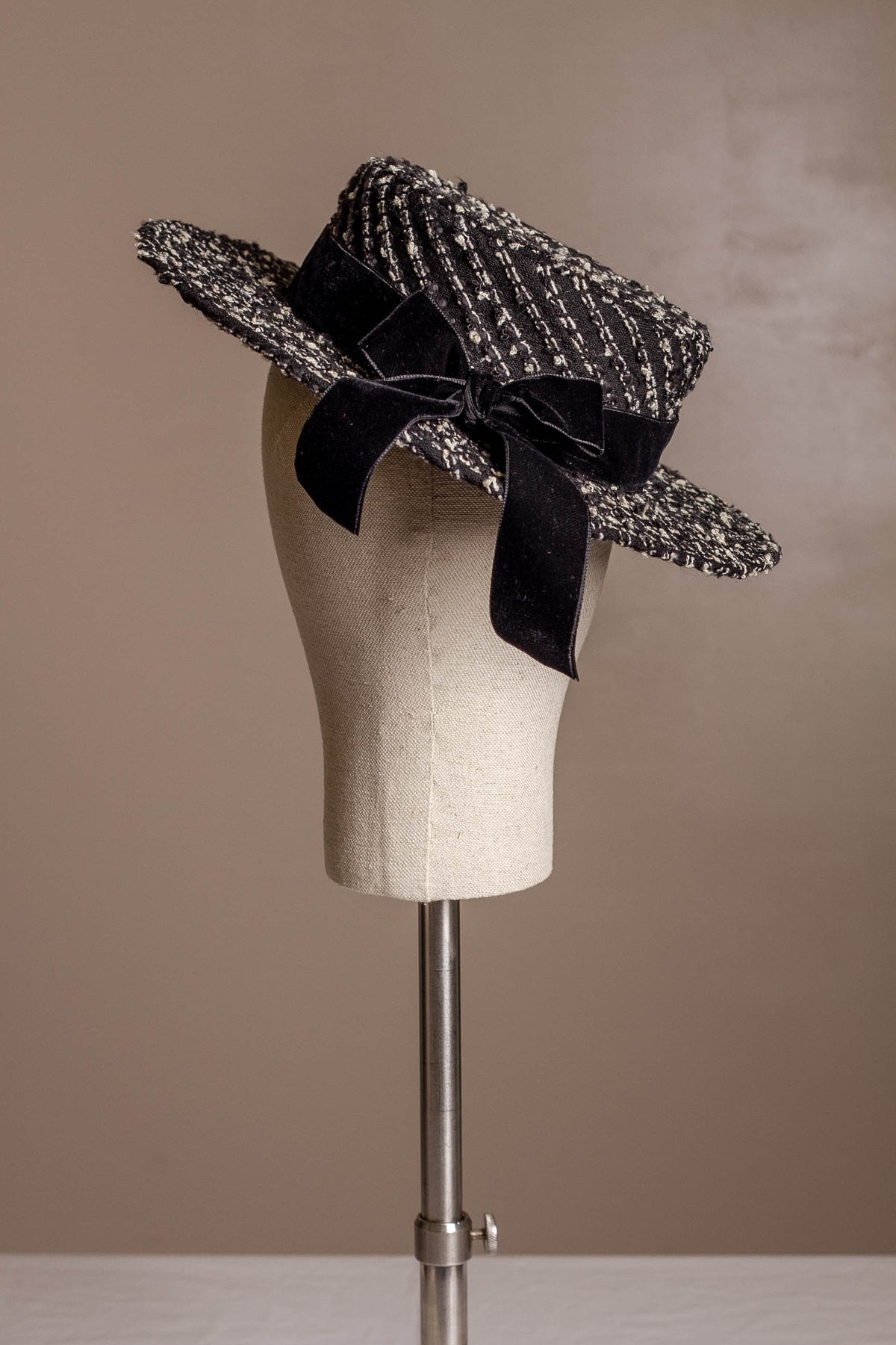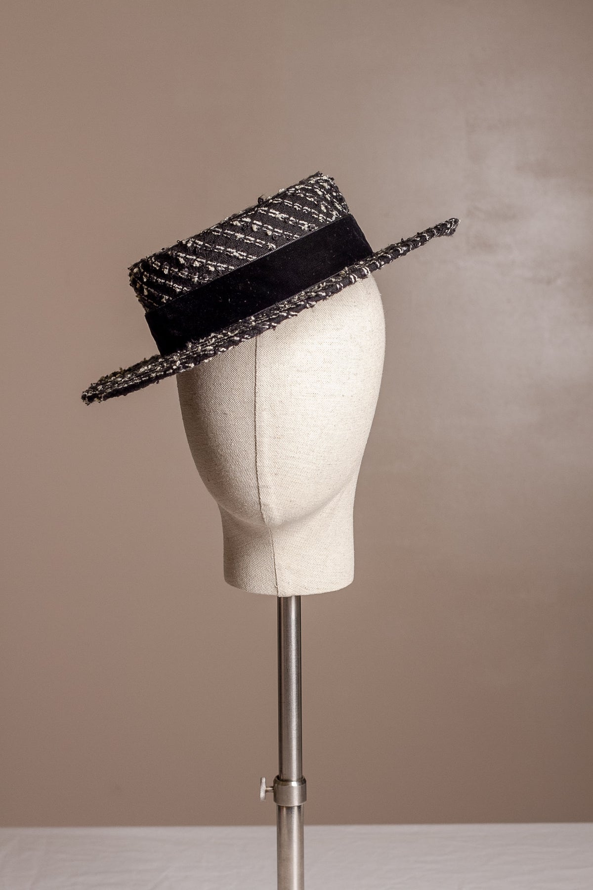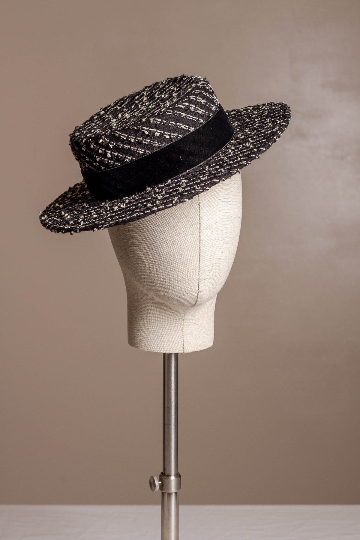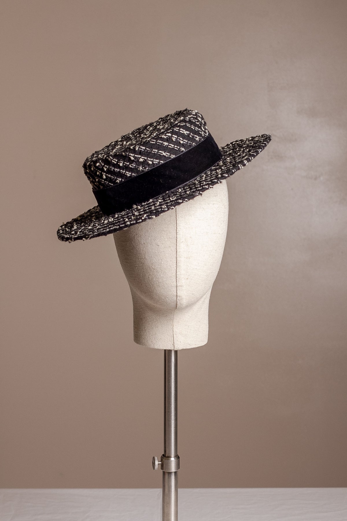 A luxurious boater hat made with 100% English Tweed, finished with an elegant black velvet ribbon, perfect to channel your inner Chanel vibes. A statement and elegant piece, suitable for everyday use as well as for the racing season, for a wedding or for an alternative hat-loving bride.