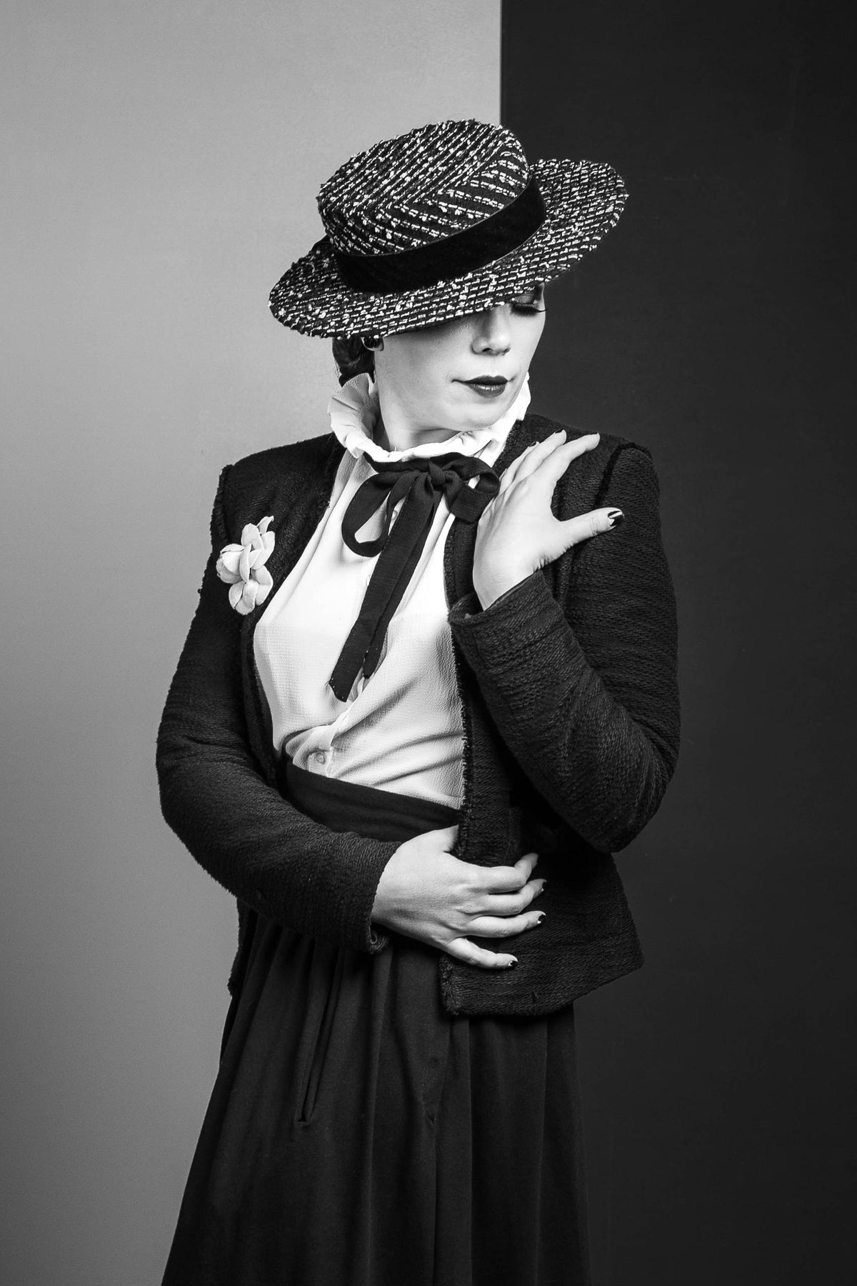 A black and white image of a woman wearing a luxurious boater hat made with 100% English Tweed, finished with a black velvet ribbon.