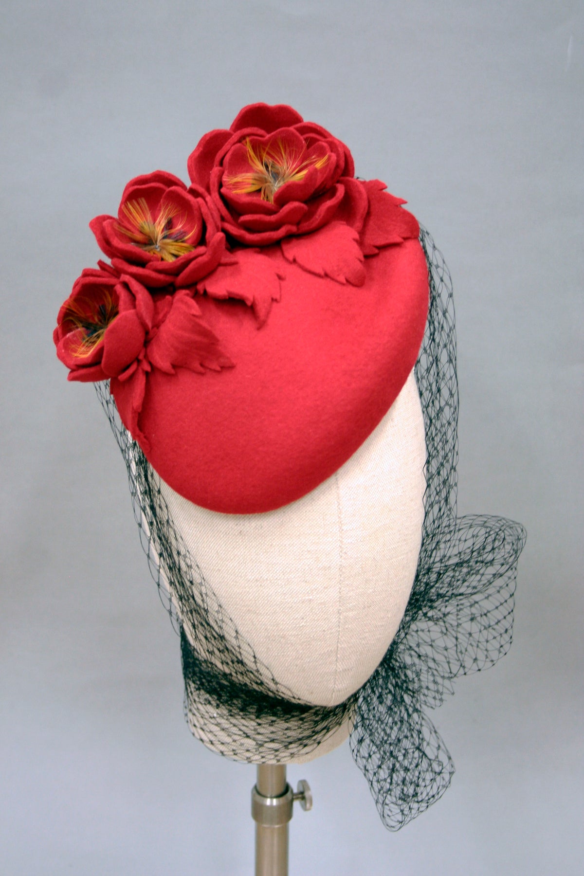 A beautifully made soft felt cocktail hat with handmade felt roses, completed with a long veiling wrapping around the neck. Something a bit different to stand out, ideal for a mother of the bride/groom, a wedding guest, for winter horse races or for a vintage party.