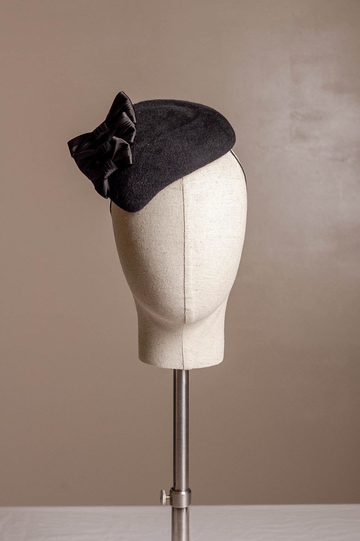 A beautiful black velour felt cocktail hat decorated with vintage silk ribbons and vintage glass beads, easy to wear and suitable for many occasions. Something very classic and elegant, ideal for a mother of the bride/groom, a wedding guest, winter races, or Christmas and New Year's Eve parties.
