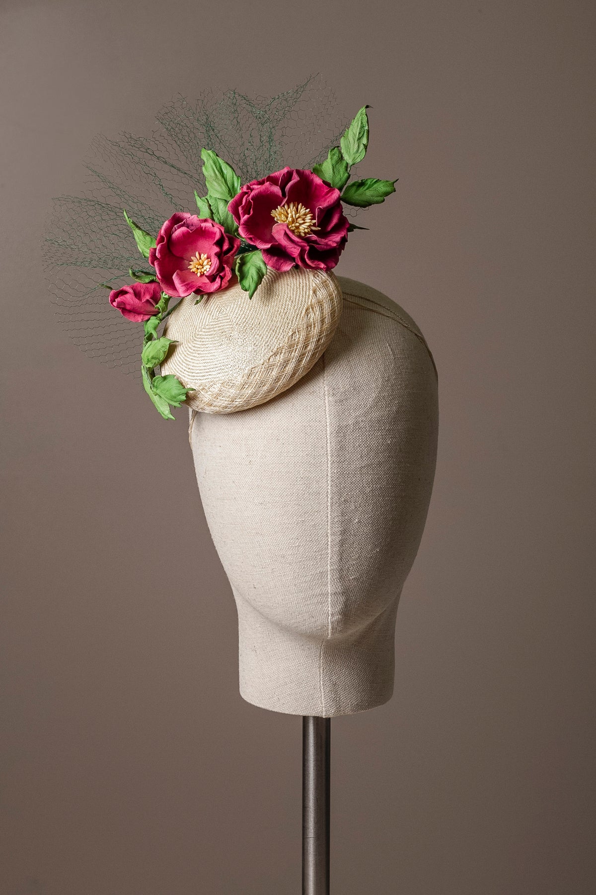 A sweet one-of-a-kind small cocktail hat made with rare vintage neutral paribuntal straw, decorated with hand-tinted leather roses and finished with silk vintage veiling. This lovely little piece is perfect for a young wearer or for someone who likes to stand out but doesn't love big hats. Perfectly suitable for a wedding or for a day at the races (Royal Enclosure approved).