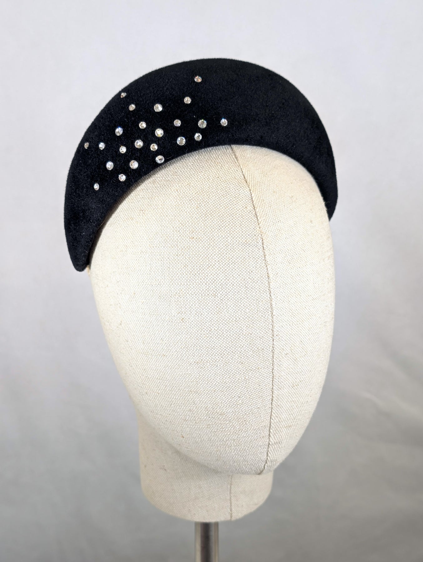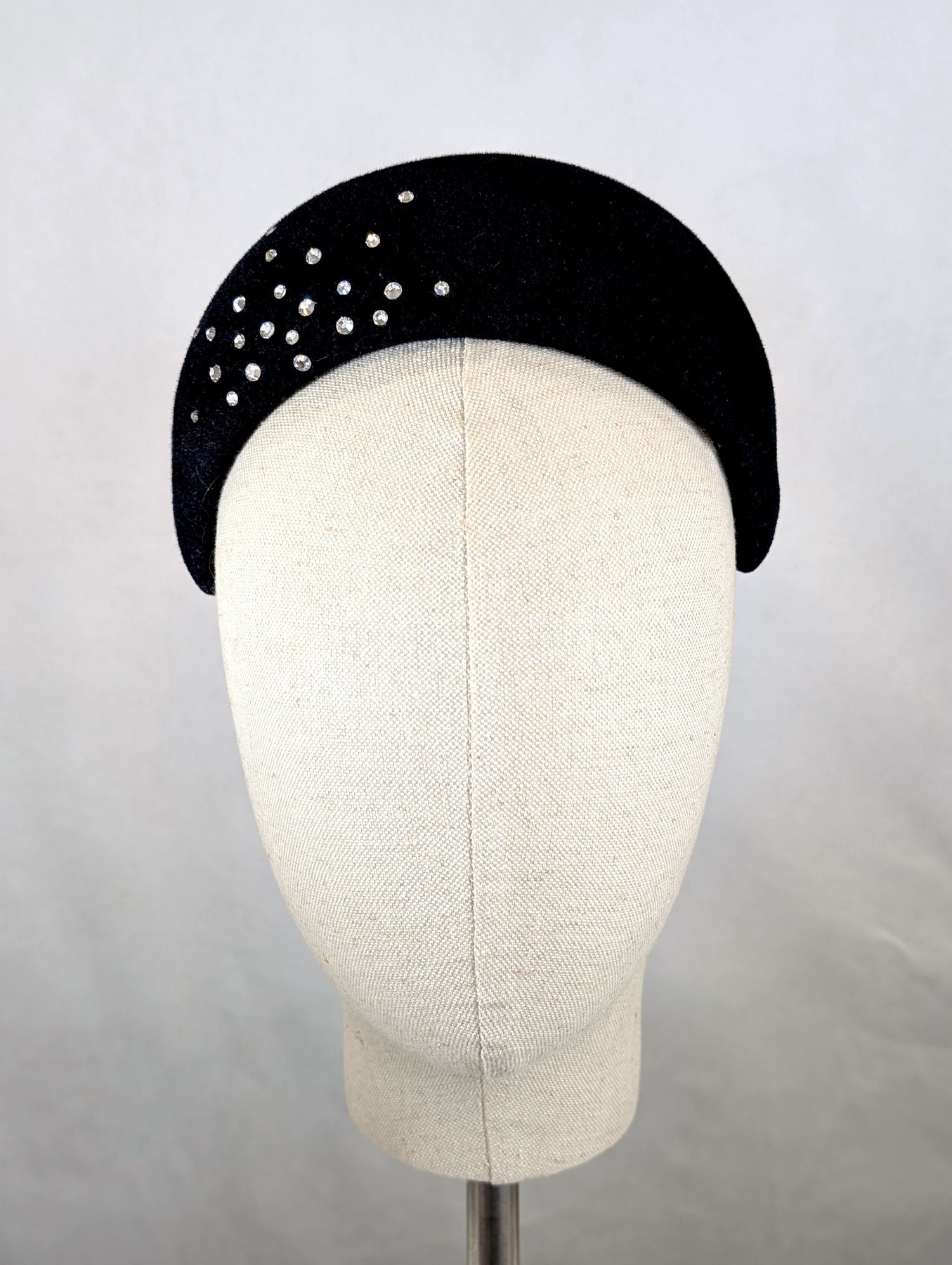 This black velour felt headband adorned with Swarovski crystals offers a refined blend of casual elegance and timeless style. Its sleek design complements smaller facial features perfectly while remaining universally flattering. Ideal for elevating everyday looks or adding a subtle sparkle to special occasions, this headband combines quality materials with enduring sophistication.