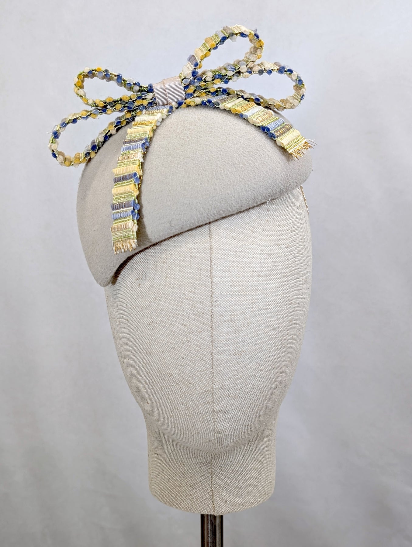 The Bowie Cocktail Hat - Chunky Silk features a dove grey velour felt teardrop base, adorned with chunky silk in soft green, pale yellow, and pale blue hues, accented by delicate gold lurex thread. Its flattering shape offers an elegant silhouette suited to all seasons, making it an ideal accessory for winter racing events, weddings, and a variety of less formal occasions. This sophisticated design blends understated luxury with versatile style, perfect for those seeking refinement with a subtle touch of colour.
