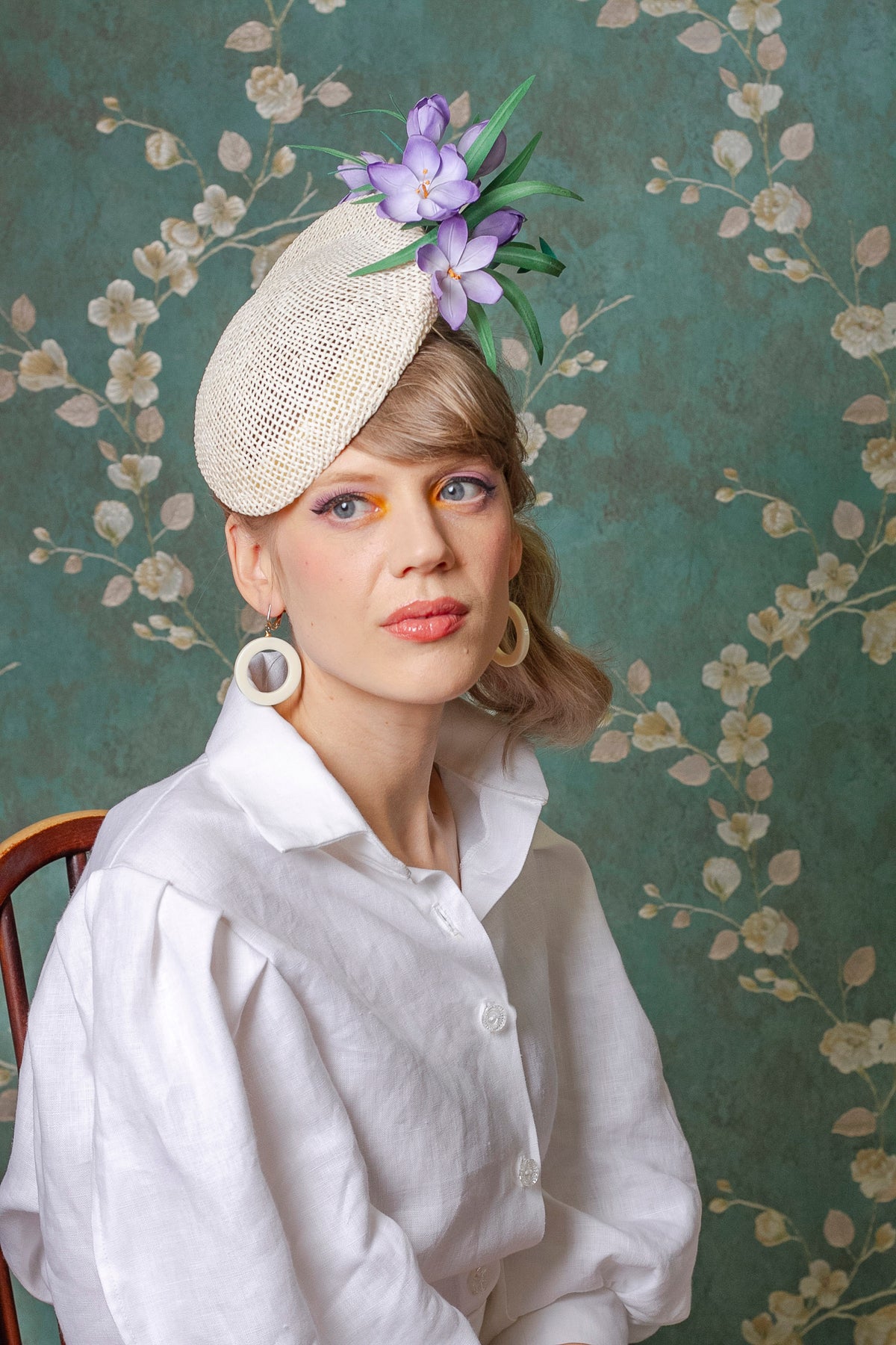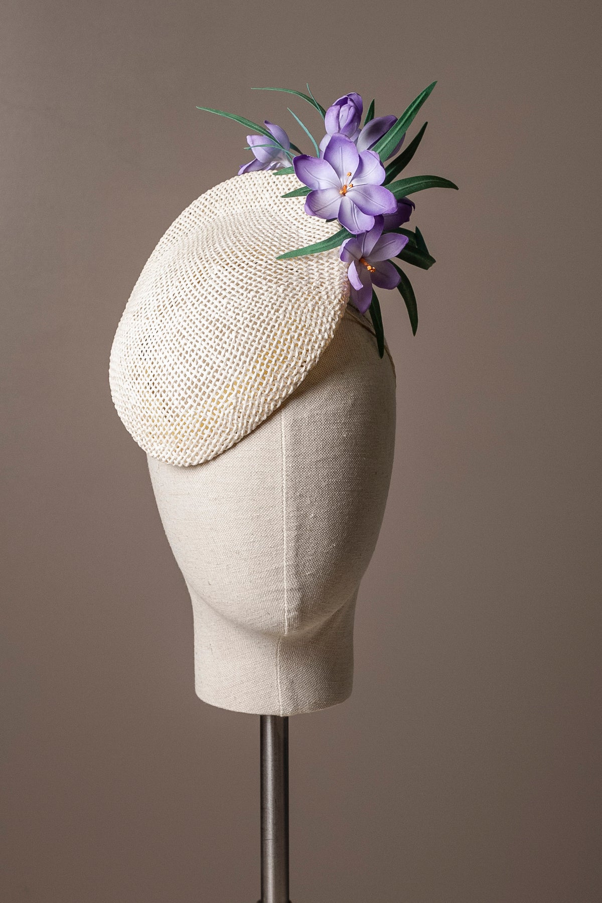 A delicate and beautifully crafted duck-tail percher cocktail hat, made with Toyo twisted paper and decorated with hand made cotton crocuses. A hymn to serene walks in Spring fields, perfect for every special occasion, from horse-racing (Royal Enclosure approved) to a countryside wedding. It is also ideal for a bride who likes a bit of a statement