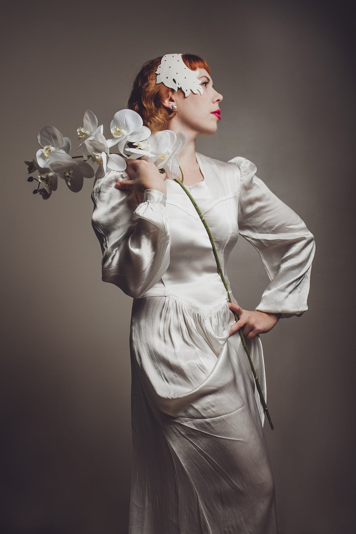 Inspired by Art Deco, this ivory felt headpiece is designed to be worn like a flat tiara and it sits slightly forward to touch your temples. It is encrusted with Swarovski crystals to add some sparkling touches. A bridal veil can be attached to it to finish the romantic look.