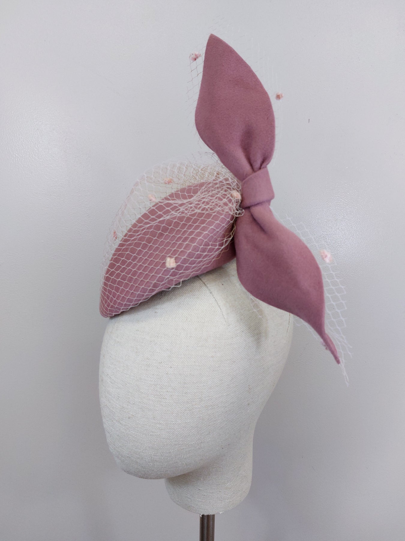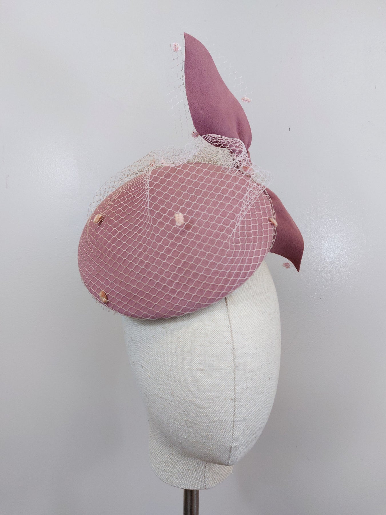This design is modern, classy and timeless. Made using a specially designed block, it is a perching disc that sits comfortably on your head, decorated with a floating felt bow and finished with spotty vintage veiling.